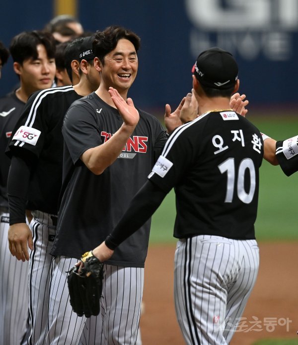 19일 서울 고척스카이돔에서 ‘2022 신한은행 MY CAR KBO리그’ LG 트윈스와 키움 히어로즈 경기가 열렸다. 4-2 역전승을 거둔 후 LG 승리투수 진해수가 하이파이브 하고 있다.
