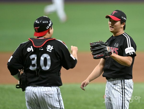 19일 서울 고척스카이돔에서 ‘2022 신한은행 MY CAR KBO리그’ LG 트윈스와 키움 히어로즈 경기가 열렸다. 연장 10회초 등판한 LG 고우석이 이닝을 마무리한 후 하이파이브 하고 있다.