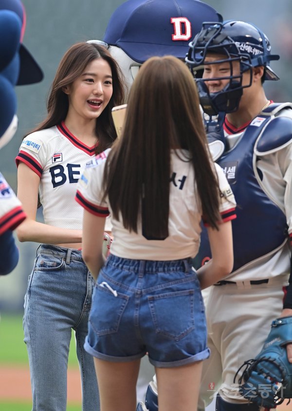 19일 서울 잠실야구장에서 열린 ‘2022 신한은행 SOL KBO리그’ 두산 베어스와 KT 위즈의 경기에 앞서 아이브 장원영이 시구를 마친 후 두산 박세혁으로부터 볼을 받고 있다.