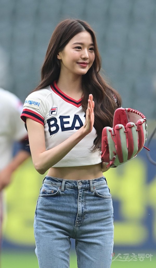 19일 서울 잠실야구장에서 열린 ‘2022 신한은행 SOL KBO리그’ 두산 베어스와 KT 위즈의 경기에 앞서 아이브 장원영이 시구를 마친 후 손뼉을 치고 있다.