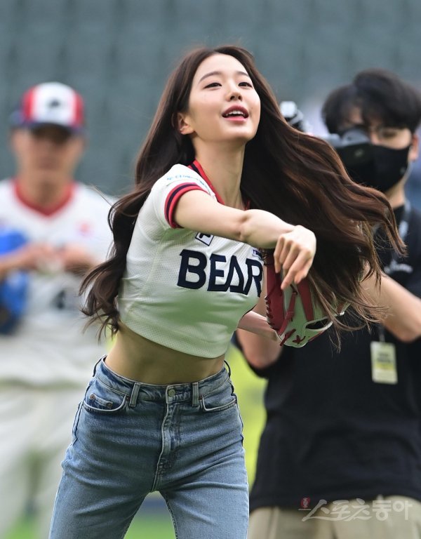 19일 서울 잠실야구장에서 열린 ‘2022 신한은행 SOL KBO리그’ 두산 베어스와 KT 위즈의 경기에 앞서 아이브 장원영이 시구를 하고 있다.