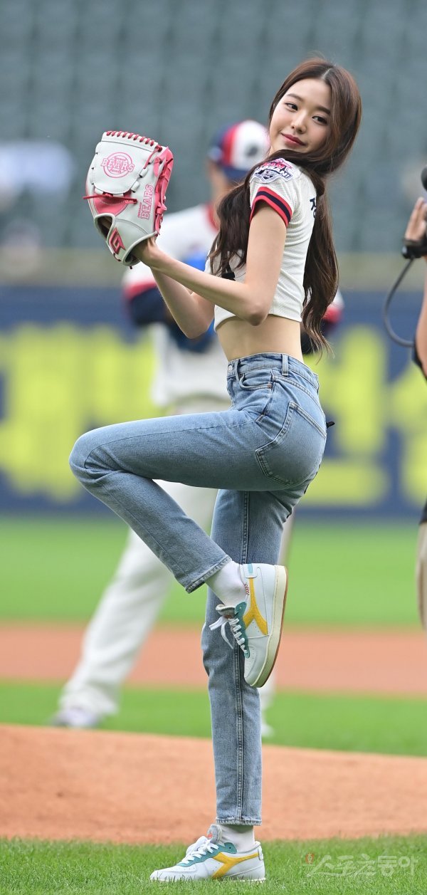 19일 서울 잠실야구장에서 열린 ‘2022 신한은행 SOL KBO리그’ 두산 베어스와 KT 위즈의 경기에 앞서 아이브 장원영이 시구를 하고 있다.