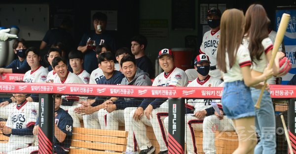 19일 서울 잠실야구장에서 열린 ‘2022 신한은행 SOL KBO리그’ 두산 베어스와 KT 위즈의 경기에 앞서 두산 선수들이 시구, 시타를 마친 아이브 멤버들을 바라보고 있다.