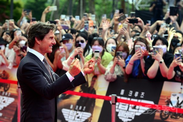 19일 서울 잠실 롯데월드타워 야외광장에서 열린 영화 ‘탑건: 매버릭’ 레드카펫 행사에 참석한 할리우드 배우 톰 크루즈가 팬들과 인사를 나누고 있다.