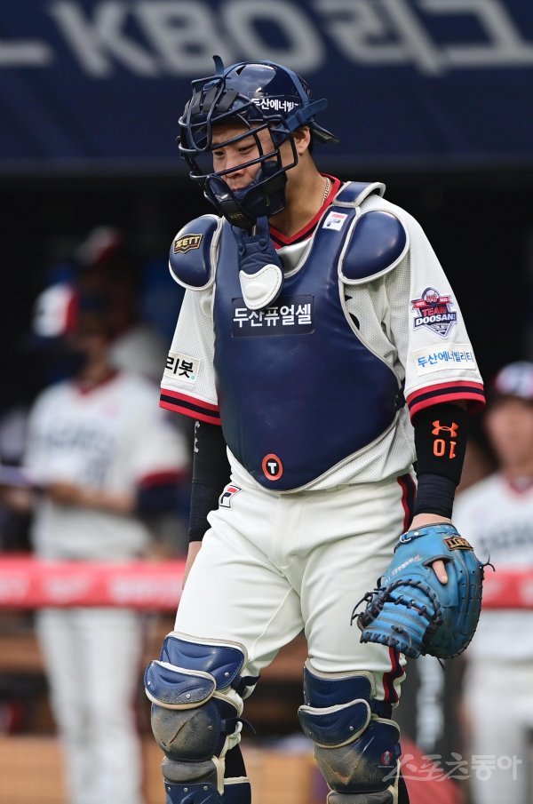 19일 서울 잠실야구장에서 열린 ‘2022 신한은행 SOL KBO리그’ 두산 베어스와 KT 위즈의 경기에서 3회초 2사 1, 3루 상황에서 두산 박세혁이 투구된 볼을 놓치며 동점을 허용하자 아쉬워하고 있다.