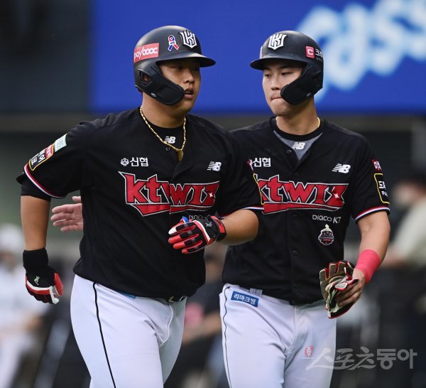 19일 서울 잠실야구장에서 열린 ‘2022 신한은행 SOL KBO리그’ 두산 베어스와 KT 위즈의 경기에서 3회초 2사 2루 KT 강백호가 역전 우월 2점 홈런을 쳐낸 후 배정대의 축하를 받고 있다. 잠실 | 주현희 기자 teth1147@donga.com