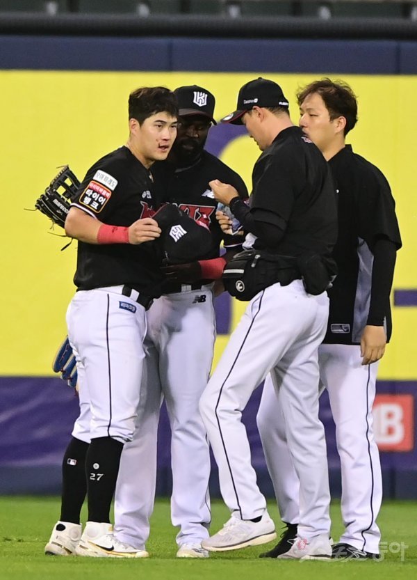 19일 서울 잠실야구장에서 열린 ‘2022 신한은행 SOL KBO리그’ 두산 베어스와 KT 위즈의 경기에서 9회말 무사 두산의 좌전 안타를 수비하는 과정에서 KT 배정대가 알포드와 충돌하며 출혈을 일으키고 있다.