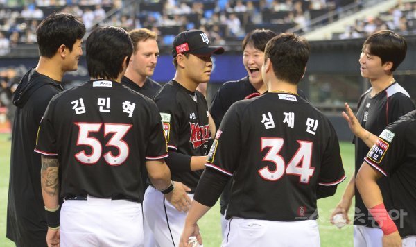 19일 서울 잠실야구장에서 열린 ‘2022 신한은행 SOL KBO리그’ 두산 베어스와 KT 위즈의 경기에서 8회말 수비를 마친 KT 소형준이 더그아웃 앞에서 동료들의 축하를 받고 있다.