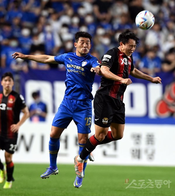 19일 경기도 수원월드컵경기장에서 열린 ‘하나원큐 K리그1 2022’ 수원 삼성과 FC 서울의 경기에서 수원 윤종규와 서울 조영욱이 공중볼을 다투고 있다.