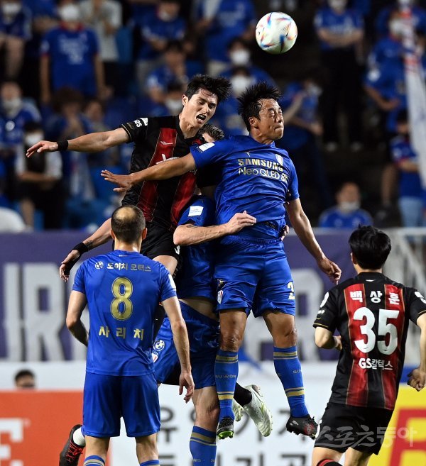 19일 경기도 수원월드컵경기장에서 열린 ‘하나원큐 K리그1 2022’ 수원 삼성과 FC 서울의 경기에서 수원 염기훈이 서울 선수와 공중볼을 다투고 있다.