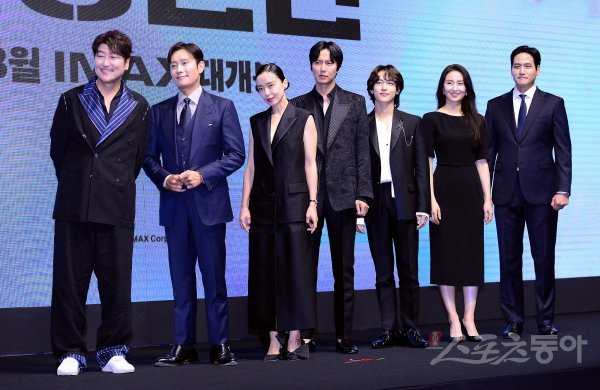 20일 서울 소공동 웨스틴조선에서 열린 영화 ‘비상선언’ 제작보고회에 참석한 송강호, 이병헌, 전도연, 김남길, 임시완, 김소진, 박해준이 포즈를 취하고 있다. ‘비상선언’은 사상 초유의 항공테러로 무조건적 착륙을 선포한 비행기를 두고 벌어지는 리얼리티 항공재난 영화이다.