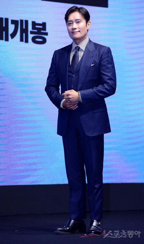 20일 서울 소공동 웨스틴조선에서 열린 영화 ‘비상선언’ 제작보고회에 참석한 이병헌이 포즈를 취하고 있다. ‘비상선언’은 사상 초유의 항공테러로 무조건적 착륙을 선포한 비행기를 두고 벌어지는 리얼리티 항공재난 영화이다.