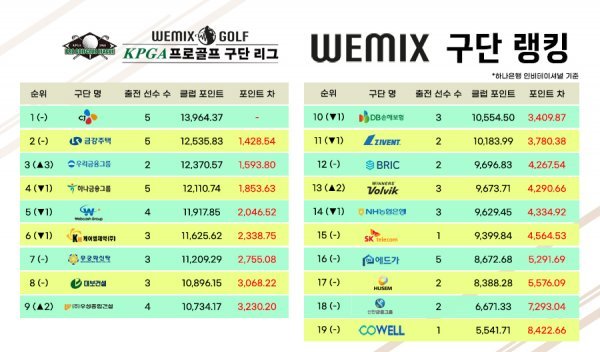 ‘제65회 KPGA 선수권대회 with A-ONE CC’ 종료 후 1만2391.17포인트로 ‘위믹스 구단 랭킹’ 1위를 지켰던 CJ는 19일 끝난 ‘하나은행 인비테이셔널’에서 1573.2점을 보태 누적 1만3964.37포인트로 9주 연속 선두를 유지했다.