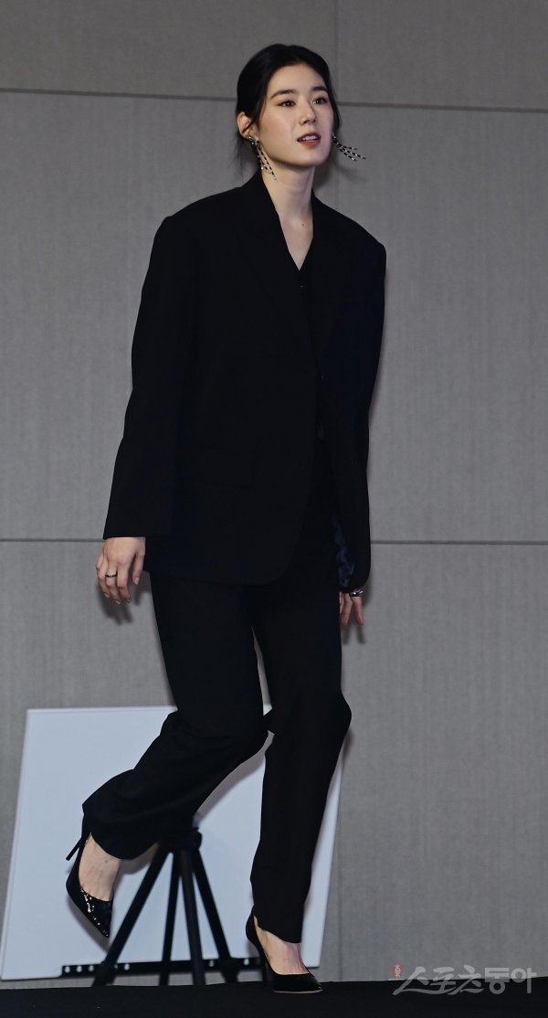 배우 정은채가 21일 서울 영등포구 여의도동 콘래드서울에서 열린 쿠팡플레이 ‘안나’ 제작발표회 무대에 오르고 있다.