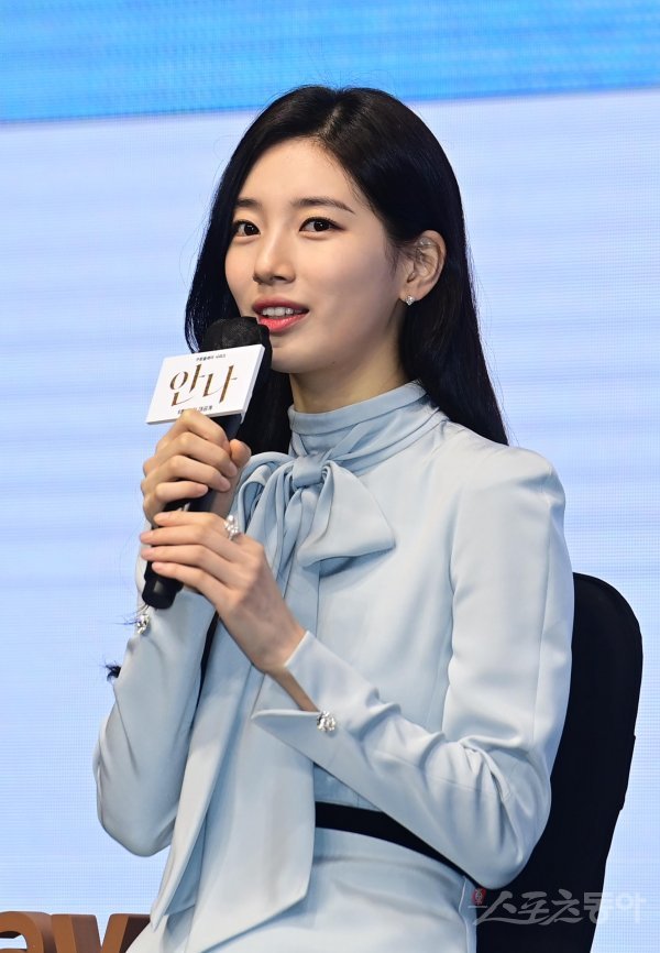배우 수지가 21일 서울 영등포구 여의도동 콘래드서울에서 열린 쿠팡플레이 ‘안나’ 제작발표회에서 인사말을 하고 있다.