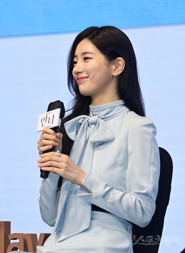 배우 수지가 21일 서울 영등포구 여의도동 콘래드서울에서 열린 쿠팡플레이 ‘안나’ 제작발표회에서 인사말을 하고 있다.