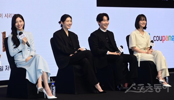 배우 수지, 정은채, 김준한, 박예영이 21일 서울 영등포구 여의도동 콘래드서울에서 열린 쿠팡플레이 ‘안나’ 제작발표회에서 질문에 웃고 있다.