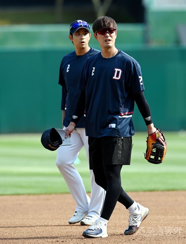 21일 인천 SSG 랜더스필드에서 ‘2022 신한은행 SOL KBO리그’ SSG 랜더스와 두산 베어스의 경기가 열린다. 경기 전 두산 김재호, 강승호가 훈련을 준비하고 있다.