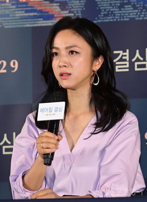 배우 탕웨이가 21일 서울 용산구 CGV용산아이파크몰점에서 열린 영화 ‘헤어질 결심’ 언론시사회에서 질문에 답하고 있다.