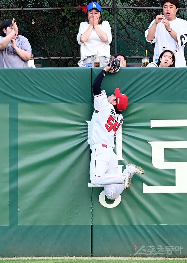 21일 인천 SSG 랜더스필드에서 ‘2022 신한은행 SOL KBO리그’ SSG 랜더스와 두산 베어스의 경기가 열렸다. 3회초 1사 1, 2루에서 SSG 최지훈이 홈런성 타구를 잡아내고 있다. 두산이 비디오판독을 요청했으나 아웃.