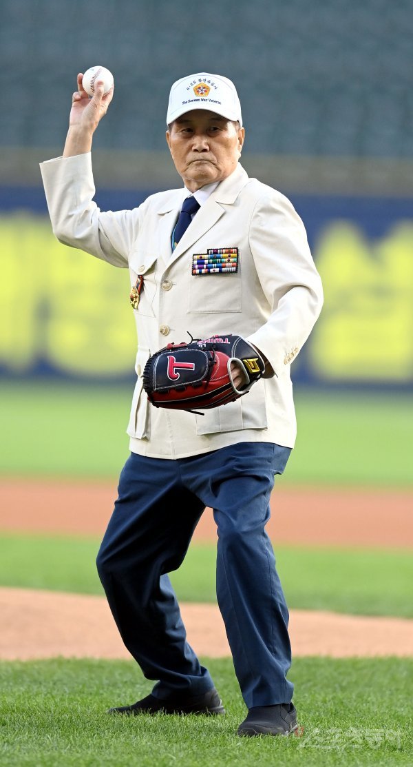 21일 서울 잠실야구장에서 ‘2022 신한은행 MY CAR KBO리그’ 한화 이글스와 LG 트윈스 경기가 열렸다. 경기 전 대한민국 6·25참전유공자회 손희원 회장이 시구를 하고 있다.