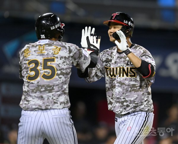 21일 서울 잠실야구장에서 ‘2022 신한은행 MY CAR KBO리그’ 한화 이글스와 LG 트윈스 경기가 열렸다. 5회말 2사 1,2루 LG 손호영이 좌월 스리런 홈런을 날리고 그라운드를 돌아 홈인해 하이파이브 하고 있다.