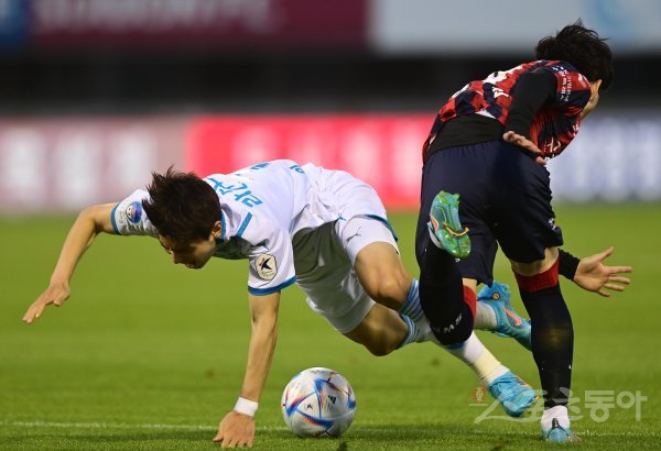 21일 경기도 수원종합운동장에서 열린 ‘하나원큐 K리그1 2022’ 수원 FC와 포항의 경기에서 포항 임상협이 수원FC 수비와 충돌 후 넘어지고 있다.