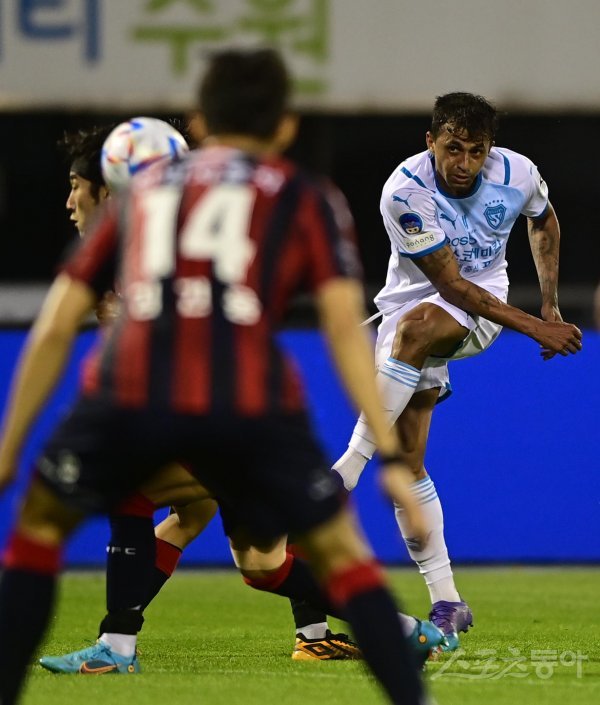 21일 경기도 수원종합운동장에서 열린 ‘하나원큐 K리그1 2022’ 수원 FC와 포항의 경기에서 포항 완델손이 중거리슛을 날리고 있다.