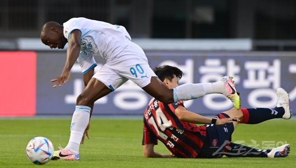 21일 경기도 수원종합운동장에서 열린 ‘하나원큐 K리그1 2022’ 수원 FC와 포항의 경기에서 포항 모세스가 볼을 향해 몸을 던지고 있다.