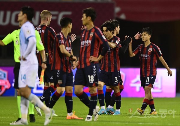 21일 경기도 수원종합운동장에서 열린 ‘하나원큐 K리그1 2022’ 수원 FC와 포항의 경기에서 포항에 2-1로 승리한 수원 FC 이승우가 동료들과 기쁨을 나누고 있다.