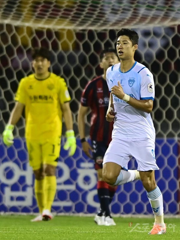 21일 경기도 수원종합운동장에서 열린 ‘하나원큐 K리그1 2022’ 수원 FC와 포항의 경기에서 포항 허용준이 만회골을 성공시킨 후 수비 진영으로 돌아가고 있다.
