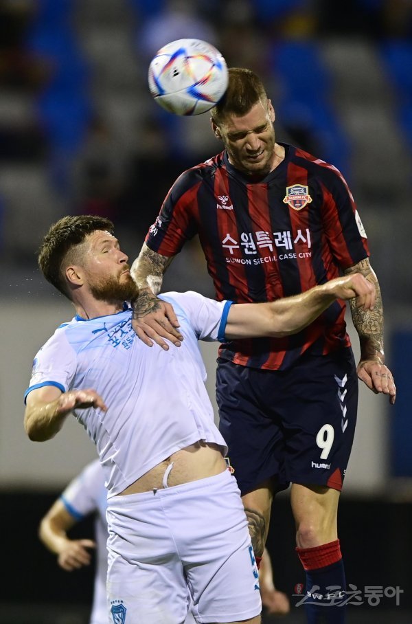 21일 경기도 수원종합운동장에서 열린 ‘하나원큐 K리그1 2022’ 수원 FC와 포항의 경기에서 수원 FC 라스가 헤딩을 하고 있다.