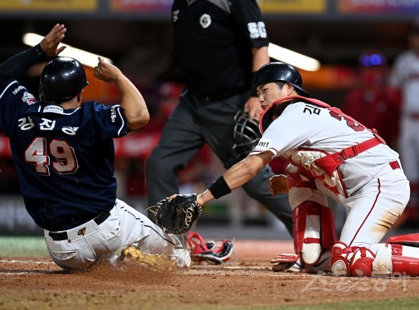 21일 인천 SSG 랜더스필드에서 ‘2022 신한은행 SOL KBO리그’ SSG 랜더스와 두산 베어스의 경기가 열렸다. 7회초 2사 2루에서 안타 때 SSG 김민식이 홈으로 파고들던 두산 2루 주자 강진성을 태그 아웃 시키고 있다.