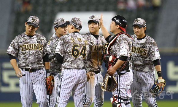 21일 서울 잠실야구장에서 ‘2022 신한은행 MY CAR KBO리그’ 한화 이글스와 LG 트윈스 경기가 열렸다. 10-4 승리를 거두며 2연승을 달린 LG 선수들이 하이파이브 하고 있다.