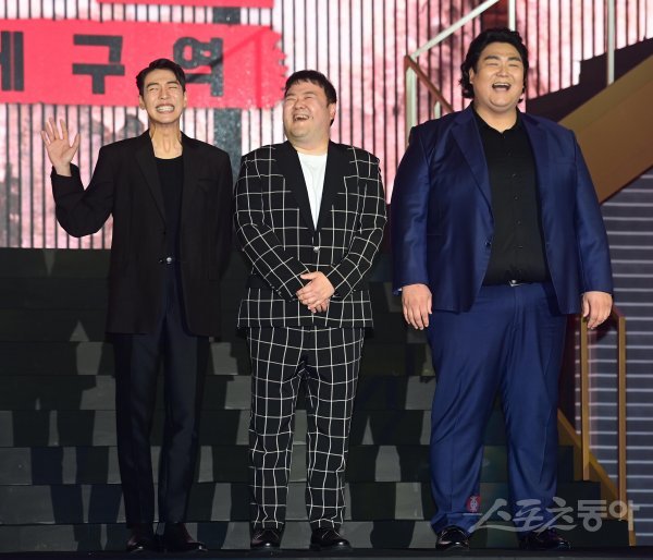 배우 이현우, 김지훈, 이규호가 22일 서울 강남구 삼성동 코엑스 그랜드볼룸에서 열린 넷플릭스 ‘종이의 집: 공동경제구역’ 제작발표회에서 포즈를 취하고 있다.