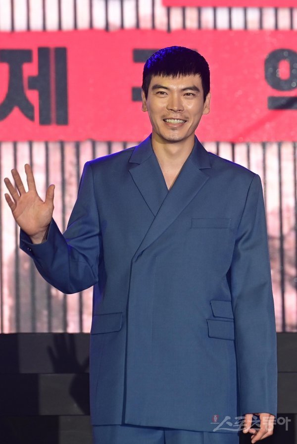 배우 김성오가 22일 서울 강남구 삼성동 코엑스 그랜드볼룸에서 열린 넷플릭스 ‘종이의 집: 공동경제구역’ 제작발표회에서 포즈를 취하고 있다.