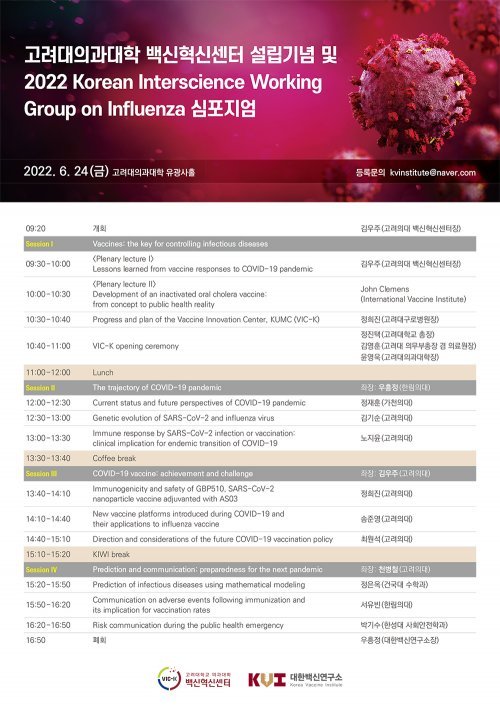 고려대학교 의과대학 백신혁신센터는 24일 오전 9시30분부터 본관 유광사홀에서 대한백신연구소와 공동으로 ‘고려대 의과대학 백신혁신센터 설립기념 및 2022 Korean Interscience Working Group on Influenza 심포지엄’을 개최한다.