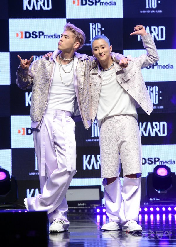 혼성 그룹 KARD(카드) 비엠과 제이셉이 22일 서울 서대문구 연세대 백주년기념관에서 진행된 다섯 번째 미니앨범 ‘Re:’ 발매 쇼케이스에서 포토타임을 갖고 있다.