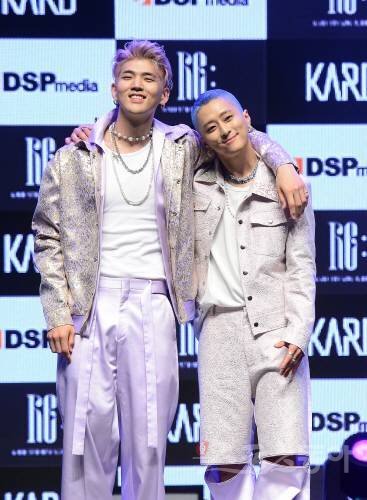 혼성 그룹 KARD(카드) 비엠과 제이셉이 22일 서울 서대문구 연세대 백주년기념관에서 진행된 다섯 번째 미니앨범 ‘Re:’ 발매 쇼케이스에서 포토타임을 갖고 있다.