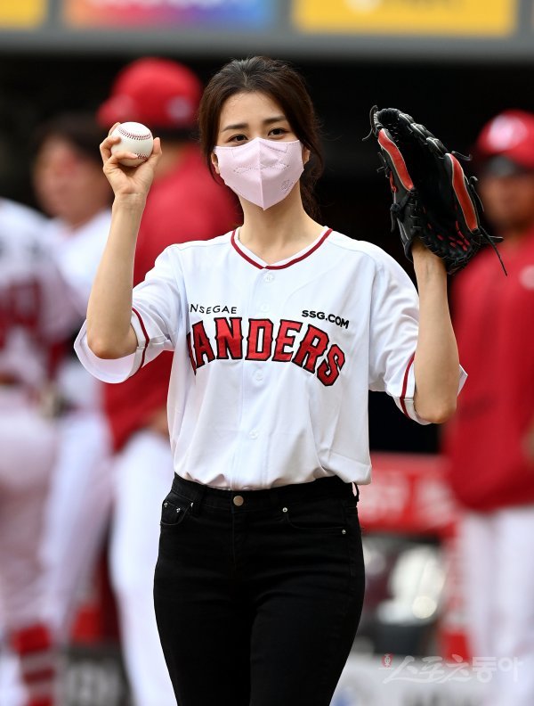 22일 인천 SSG 랜더스필드에서 ‘2022 신한은행 SOL KBO리그’ SSG 랜더스와 두산 베어스의 경기가 열렸다. 배우 박하선이 시구에 앞서 포즈를 취하고 있다.