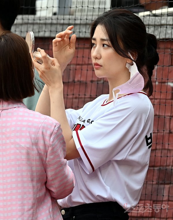 22일 인천 SSG 랜더스필드에서 ‘2022 신한은행 SOL KBO리그’ SSG 랜더스와 두산 베어스의 경기가 열렸다. 경기 전 시구자로 나선 배우 박하선이 화장을 고치고 있다.