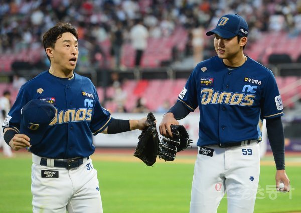 22일 경기도 수원KT위즈파크에서 열린 ‘2022 신한은행 SOL KBO리그’ KT 위즈와 NC 다이노스의 경기에서 3회말 수비를 마친 NC 손아섭과 구창모가 주먹을 맞대고 있다.