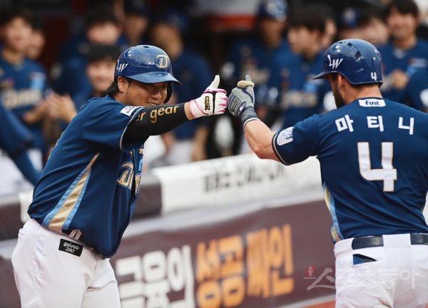 22일 경기도 수원KT위즈파크에서 열린 ‘2022 신한은행 SOL KBO리그’ KT 위즈와 NC 다이노스의 경기에서 1회초 1사 2루 NC 마티니가 우월 2점 홈런을 쳐낸 후 박석민의 축하를 받고 있다.