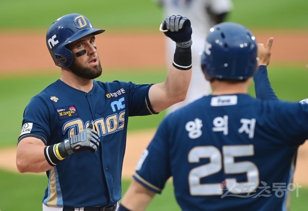 22일 경기도 수원KT위즈파크에서 열린 ‘2022 신한은행 SOL KBO리그’ KT 위즈와 NC 다이노스의 경기에서 1회초 1사 2루 NC 마티니가 우월 2점 홈런을 쳐낸 후 2루주자와 기쁨을 나누고 있다.