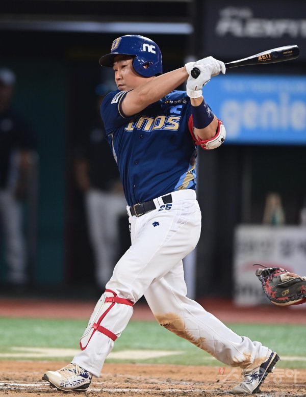 22일 경기도 수원KT위즈파크에서 열린 ‘2022 신한은행 SOL KBO리그’ KT 위즈와 NC 다이노스의 경기에서 6회초 1사 만루 NC 양의지가 2타점 좌전 2루타를 치고 있다.