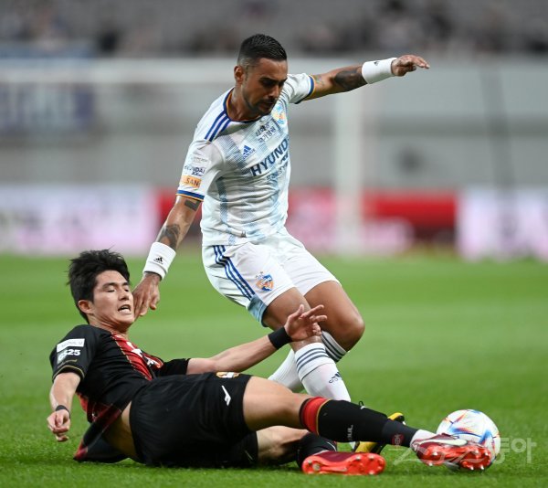 22일 서울월드컵경기장에서 열린 프로축구 ‘하나원큐 K리그1 2022’ FC서울과 울산현대 경기에서 전반전 울산 레오나르도의 공격을 서울 이상민이 태클로 막아내고 있다.