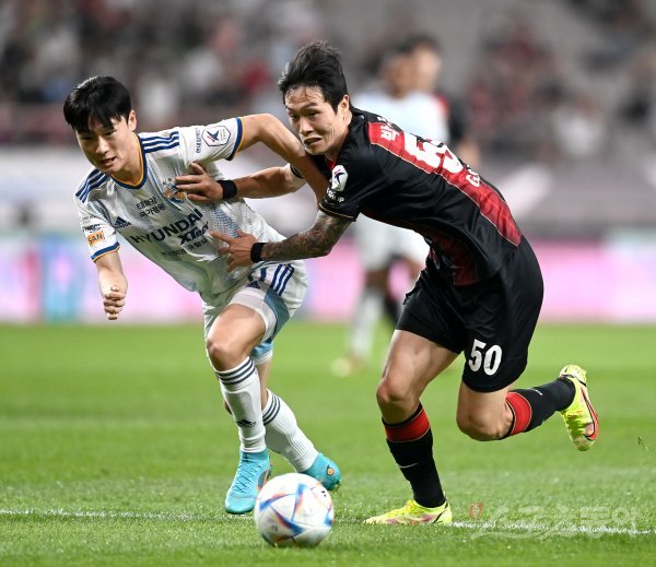 22일 서울월드컵경기장에서 열린 프로축구 ‘하나원큐 K리그1 2022’ FC서울과 울산현대 경기에서 서울 박동진이 울산 엄원상의 수비를 뚫고 공격하고 있다.