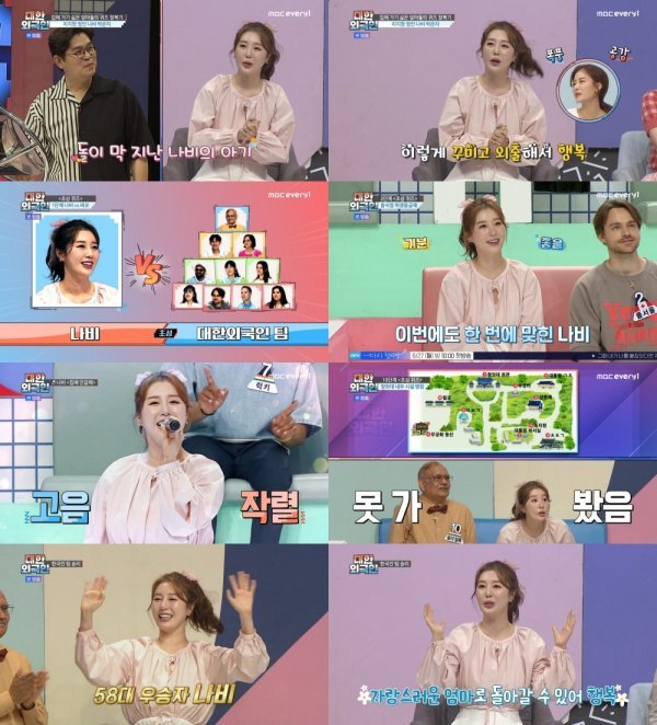 나비는 지난 22일 방송된 MBC every1 예능프로그램 ‘대한외국인’에 게스트로 출연했다. ‘집에 가기 싫은 엄마들의 퀴즈 정복기’ 특집으로 진행된 이날 방송에서 나비는 육아 중인 근황을 전하며 “풀메이크업하고 외출하니까 너무 행복하다. 오늘 녹화를 길게 하고 싶다”라며 의지를 불태워 웃음을 자아냈다.