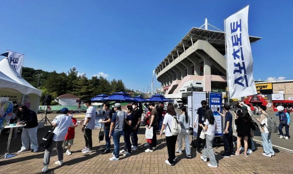 6월 11일 SSG 랜더스-한화 이글스전이 펼쳐진 인천SSG랜더스필드 앞에서 많은 시민들이 현장 무료체험 행사에 참여하기 위해 줄을 서 있다. 사진제공 | 스포츠토토코리아