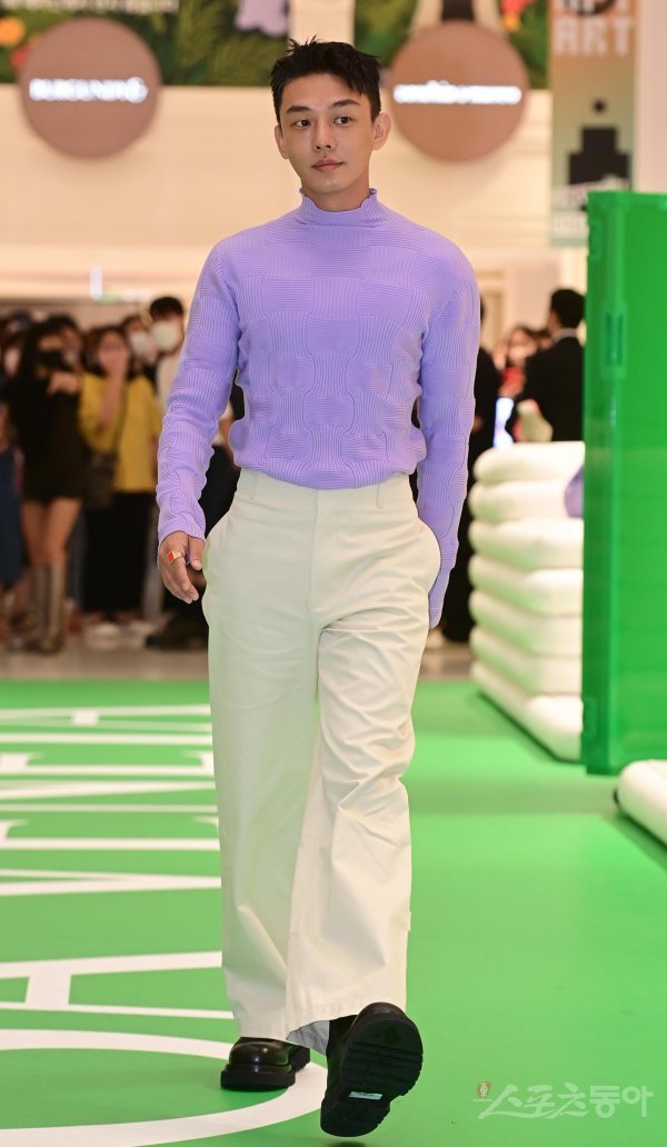 배우 유아인이 23일 서울 서초구 반포동 한 백화점 강남점에서 열린 한 이탈리안 럭셔리 패션 브랜드의 팝업 스토어 오픈 포토콜 행사에 입장하고 있다.
